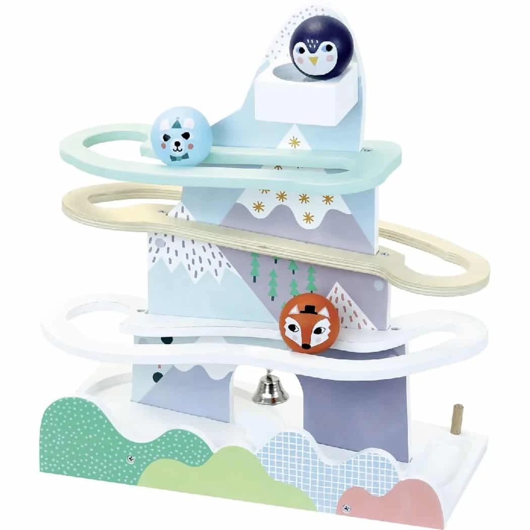 - A beautiful wooden waterfall marble game which toddlers and young children can have hours of fun rolling balls down and ringing the bell. Balls are fox, cat or penguin themed and it looks lovely on any shelf.