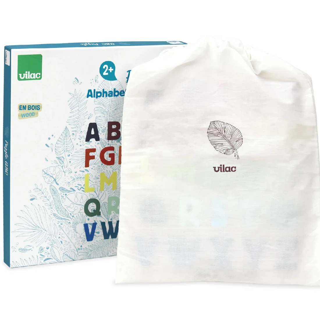 - Colourful wooden alphabet puzzle containing 26 letters, a wooden base to place them in and even a storage bag for easy tidy up!